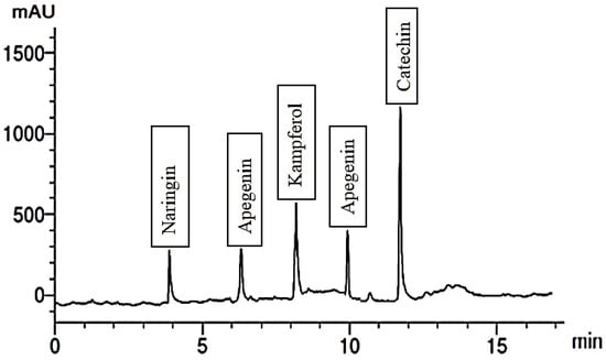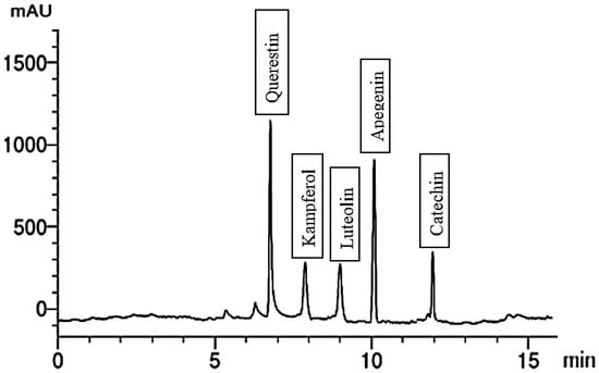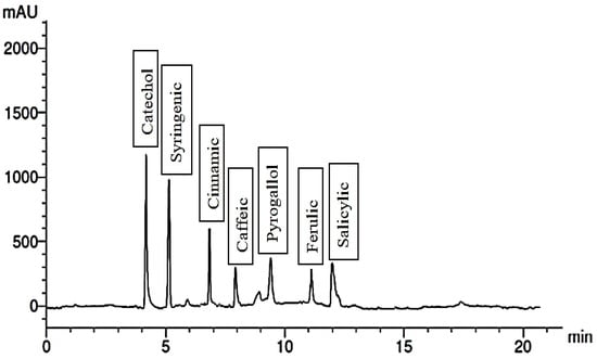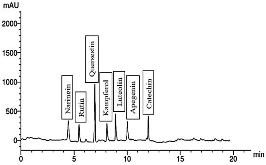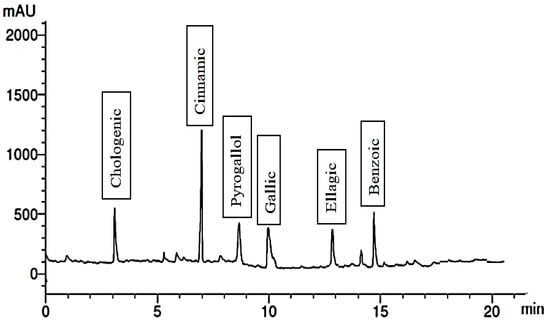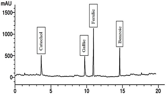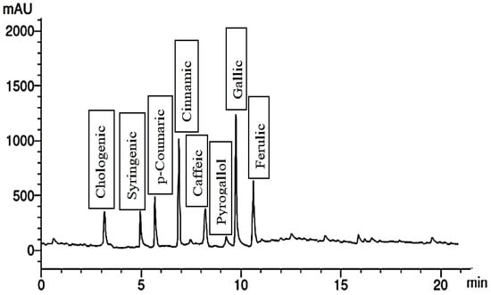 As per the methodologies outlined in studies conducted by Kuntic et al. and Lin et al. [,], the identification of phenolic compounds was carried out utilizing an HPLC (high-performance liquid chromatography) system, specifically, the Agilent 1260 series (Agilent Technologies, GmbH, Boblingen, Germany). This HPLC system was equipped with an autosampler (L-2200), a quaternary pump (L-2130), a degasser (G 1322 A), and a diode array detector (L-2455). The chromatographic column employed was an Eclipse C18 with dimensions of 4.6 mm (diameter) × 250 mm (length) and a particle size of 5 µm. The flow rate was set at 0.9 mL/min.