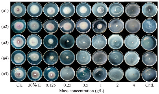Effects of different concentrations of ginger essential oil (a1), linalool (a2), eugenol (a3), citral (a4), and CA (a5) on F. oxysporum FOX-1 growth after 5 days of incubation; 30% E, 30% ethanol; CK, control (essential oils and ethanol are not included); Chtl, chlorothalonil (8 g/L).