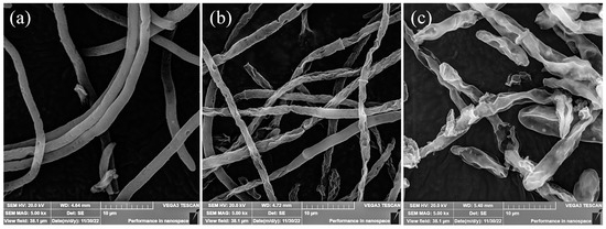 The effects of CA (1/2 MIC or MIC) treatments on the morphology of F. oxysporum FOX-1 mycelium were observed using SEM. The mycelium of the CK group grew normally and had a smooth, plump appearance devoid of cracks and wrinkles (Figure 2a). In contrast, 1/2 MIC CA treatment resulted in obvious wrinkles and depressions on the mycelial surface (Figure 2b). In addition, MIC-CA-treated mycelium exhibited severe shrinkage, collapse, deformation, surface roughness, and other structural abnormalities (Figure 2c), indicating that CA disrupts the permeability of the cell membrane and promotes the entry of CA into the cell, leading to cell shrinkage or atrophy.