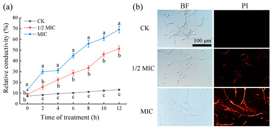 CA damaged the cell membrane of F. oxysporum FOX-1. (a) Relative conductivity of mycelia; and (b) PI staining of mycelia. PI represents PI staining; and BF represents the bright field. The bars on the curves represent standard deviations, and different letters at the same time point represent significant differences (p < 0.05).