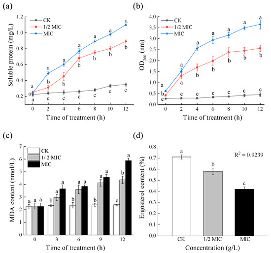 Effects of different CA concentrations on the extracellular leakage of (a) soluble proteins, (b) nucleic acids, (c) malondialdehyde, and (d) ergosterol contents. The bars on the curves represent standard deviations, and different letters at the same time point represent significant differences (p < 0.05).