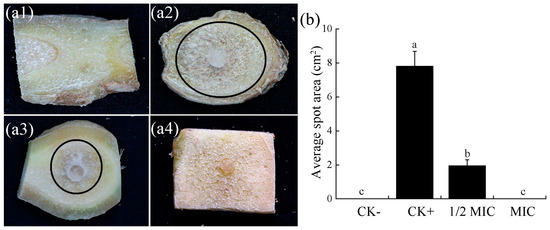 Variation in the infectivity of F. oxysporum FOX-1 on rhizome sections after CA treatment. (a1) CK−, negative control, no inoculation; (a2) CK+, positive control, inoculated with F. oxysporum FOX-1; (a3) 1/2 MIC, inoculated with F. oxysporum FOX-1 and treated with 0.125 g/L CA; (a4) MIC, inoculated with F. oxysporum FOX-1 and treated with 0.25 g/L CA. (b) Graphical representation of the fungal lesion area. Different small letters meant significant difference among treatments at 0.05 level.