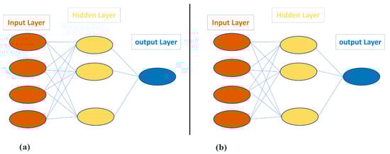 The multilayer perceptron (MLP), recognized as one of the foremost artificial neural networks (ANNs), is structured with multiple layers, comprising at least one hidden layer in addition to an input layer and an output layer, as depicted in Figure 1a. MLP employs a supervised training procedure in which it is presented with both input and output variables as part of the training set. The training process persists until Equation (4) is minimized.