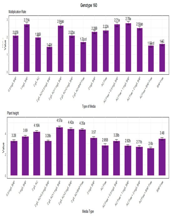 Multiplication rate and plant height for genotype 160. Lowercase letters display the interactions between BAP and AC, uppercase letters display the averages of BAP and AC separately.