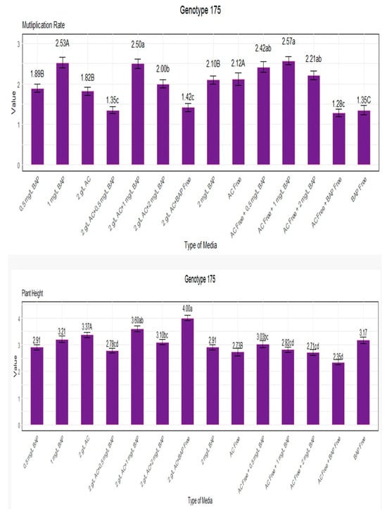 Multiplication rate and plant height for genotype 175. Lowercase letters display the interactions between BAP and AC, uppercase letters display the averages of BAP and AC separately.