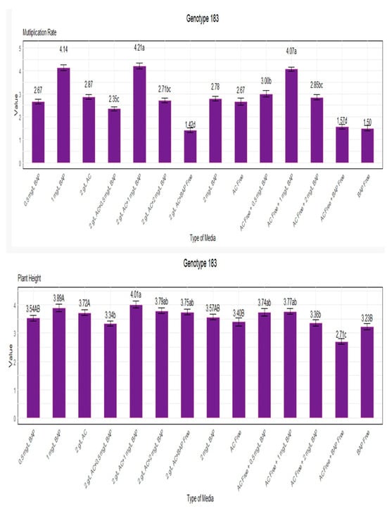 Figure 4 shows the results of our investigation into the multiplication rate and plant height of genotype 183. When grown in a medium with 1 mg/L BAP and 2 g/L AC, the genotype showed the most significant multiplication rate of 4.21, as shown in Figure 4. The settings without BAP and with 2 g/L AC had the lowest multiplication rate, 1.42, indicating an unfavorable growing environment.