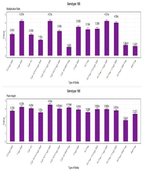 Conversely, the absence of BAP and the presence of 2 g/L AC resulted in the lowest multiplication rate (1.42). Plant height followed a similar trend, with the most significant height (4.21) observed under conditions with 1 mg/L BAP and 2 g/L AC, and the lowest height (2.60) in the absence of both BAP and AC. Finally, for genotype 198, the maximum multiplication rate (4.21) was attained with 1 mg/L BAP, with and without AC. The lowest multiplication rate (1.17) was recorded when cultured in media lacking both BAP and AC. Plant height exhibited a similar pattern, with the best results (4.50) under conditions with a combination of 1 mg/L BAP and 2 g/L AC, and the lowest height (2.60) in the absence of both BAP and AC.