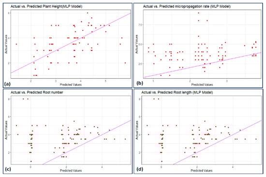 Scatterplot actual against predicted values of (a) plant height, (b) micropropagation rate, (c) number of roots, and (d) root length using MLP model analysis.