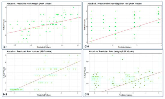 Scatterplot actual against predicted values of (a) plant height, (b) micropropagation rate, (c) number of roots, and (d) root length using BRF model analysis.