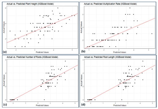 Scatterplot actual against predicted values of (a) plant height, (b) micropropagation rate, (c) number of roots, and (d) root length using XGBoost model analysis.