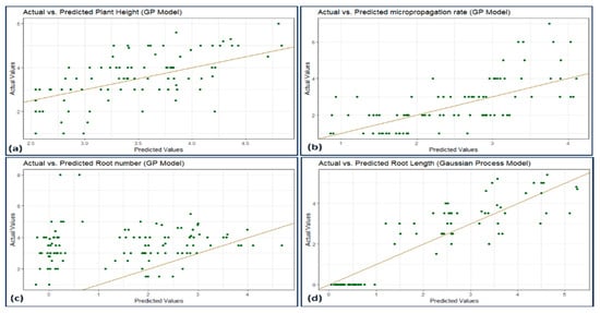 Scatterplot actual against predicted values of (a) plant height, (b) micropropagation rate, (c) number of roots, and (d) root length using GP model analysis.