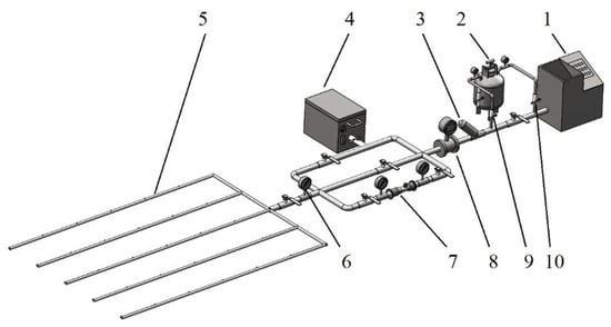 Schematic diagram of the drip irrigation uniformity test device. 1. Intelligent variable frequency constant temperature and pressure water tank, 2. differential pressure fertilization tank, 3. filter, 4. micro-nano bubble generator, 5. drip irrigation belt, 6. precision pressure gauge, 7. venturi injector, 8. turbine flowmeter, 9. valve 2, and 10. valve 1.