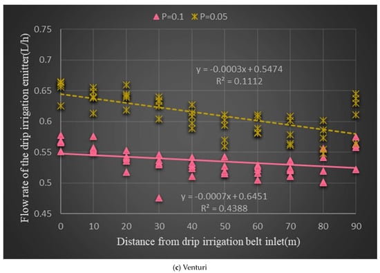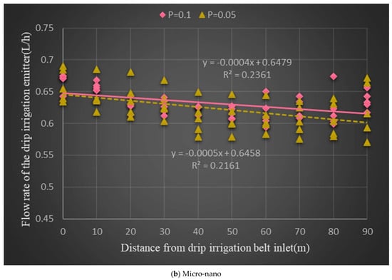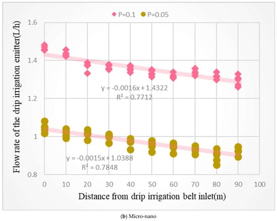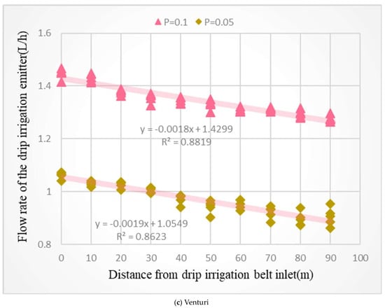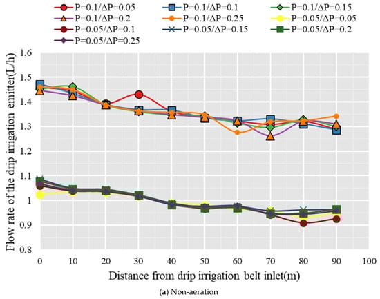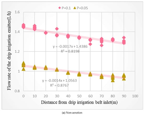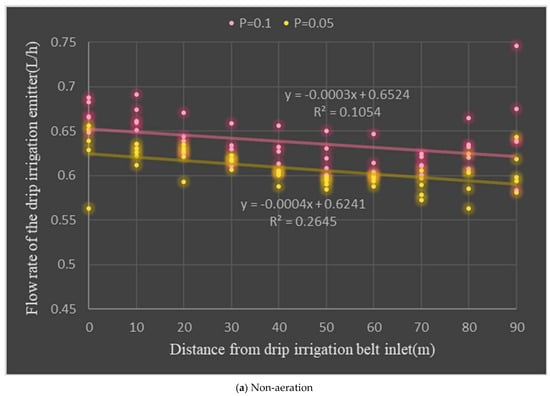 To further analyze the spatial distribution characteristics of the emitter flow rate under different technical parameter combinations, a linear fitting was performed on the emitter flow rate variation curve, as shown in Figure 3. According to the fitting curve, the slope of the fitting curve under the working pressure P = 0.1 MPa of the nonaerated test group is higher than that under the working pressure P = 0.05 MPa. In the two aeration test groups, the slope of the fitting curve remains unchanged under different working pressure conditions. After aeration, the working pressure has a significant impact on the flow rate of the emitter at the same location, but it has almost no effect on the spatial distribution of the flow rate of the emitter along the drip irrigation belt, only slowing down the rate of decrease in the flow rate of the emitter along the drip irrigation belt.