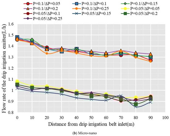 From Figure 2, it can be seen that under different technical parameter combinations, the flow distribution pattern of the emitters along the drip irrigation belt is similar: there is a certain fluctuation in the flow rate of the emitters at different positions along the drip irrigation belt, and the fluctuation pattern is consistent, but overall, it shows a gradually decreasing trend. The effect of working pressure on the flow rate of the emitter is significant. At the same position of the drip irrigation belt, the flow rate of the emitter under working pressure P = 0.1 MPa is higher than that under working pressure P = 0.05 MPa by more than 25%. The pressure difference between the inlet and outlet of fertilization irrigation and the effect of aeration on the spatial distribution of the flow rate of the drip irrigation emitter is limited. After aeration, the flow rate of the drip irrigation emitter at P = 0.1 MPa has higher distribution uniformity compared with P = 0.05 MPa, and the performance is most obvious under the micro-nano aeration method.
