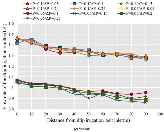 Flow distribution curves of the drip irrigation emitters along the drip irrigation belt under different experimental treatments.