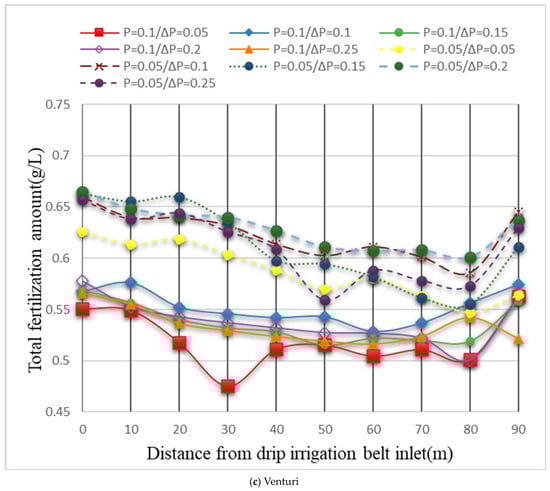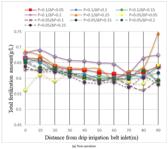 The distribution of the total amount of fertilizer applied by the drip irrigation emitter along the drip irrigation belt under various technical parameter combinations is shown in Figure 4. From the figure, it can be seen that the spatial distribution characteristics of the total amount of fertilizer applied by the drip irrigation emitter and the total amount of irrigation are similar, where both show a gradual downward trend along the drip irrigation belt, but significantly lower than the rate of decrease in the flow rate of the drip irrigation emitter. In some cases, the total amount of fertilization at the end of the drip irrigation belt slightly increases. As the total amount of irrigation water gradually decreases along the direction of the drip irrigation belt, the increasing trend in the total amount of fertilization at the end of the drip irrigation belt indicates an increase in the concentration of fertilizer solution at the end of the drip irrigation belt. After comparing the spatial distribution patterns of total fertilization under various technical parameter combinations, it can be found that compared with the flow rate of the drip irrigation emitter, the pressure has a smaller impact on the spatial distribution of total fertilization. By comprehensively analyzing the distribution curve of the total fertilization and the fitting curve of the total fertilization spatial distribution (Figure 5), it can be concluded that aeration can affect the spatial distribution of total fertilization. Compared with Venturi aeration, micro-nano aeration weakens the fluctuation in total fertilization along the drip irrigation belt and reduces the rate of decrease in total fertilization along the drip irrigation belt, significantly improving the uniformity of the fertilization distribution. At the same time, it is found that Venturi aeration increases the impact of pressure on the total amount of fertilization, while micro-nano aeration significantly weakens the impact of pressure on the total amount of fertilization.