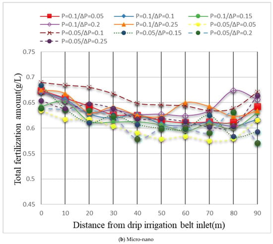 (2) In the co-application of water, fertilizer, and air, the spatial distribution characteristics of the total amount of fertilizer applied by the drip irrigation emitter are similar to the amount of irrigation. Compared with the amount of water filled by the drip irrigation emitter, the total amount of pressure fertilization has a smaller impact, and the pressure difference between the inlet and outlet of the fertilization tank does not have an impact on the flow rate or distribution characteristics of the drip irrigation emitter. Venturi aeration increases the impact of pressure on the total amount of fertilization in the drip irrigation emitter but has a limited impact on the spatial distribution of the total amount of fertilization. Micro-nano aeration can reduce the fluctuation in total fertilization along the drip irrigation belt, giving the water–fertilizer–air drip irrigation system better distribution uniformity.