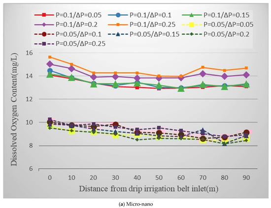 (3) The two aeration methods show similar distribution characteristics of dissolved oxygen content in the co-application of water, fertilizer, and air. The dissolved oxygen content gradually decreases along the drip irrigation belt, with a lower rate of decline compared with the distribution characteristics of water and fertilizer. The pressure difference between the inlet and outlet of the fertilizer tank does not affect the dissolved oxygen content. The pressure can have a significant impact on the dissolved oxygen content of both aeration methods and micro-nano aeration has higher dissolved oxygen content and better distribution uniformity.