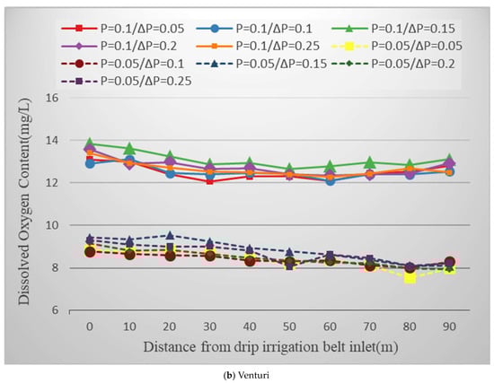 However, the distribution characteristics of the dissolved oxygen content in the irrigation water vary under the different aeration methods. Under various experimental conditions, the dissolved oxygen content is higher at a working pressure of P = 0.1 MPa than at P = 0.05 MPa. The pressure difference between the inlet and outlet of the fertilizer tank has a limited influence on the dissolved oxygen content under the different aeration methods. Under the same working conditions, the dissolved oxygen content under micro-nano aeration is higher than that under Venturi aeration.