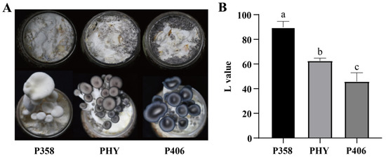 (A) Phenotypic color characteristics of P. cornucopiae strains P358, PHY, and P406. (B) Cap color brightness (L values) of P. cornucopiae strains P358, PHY, and P406. Note: The data are expressed as mean values ± standard deviations, and different lowercase letters indicate significant differences (p < 0.05) as determined by ANOVA.