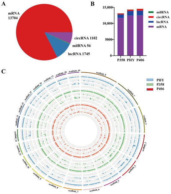 A total of 13,704 mRNAs (including 2089 newly identified genes), 1745 lncRNAs, 1102 circRNAs, and 56 predicted milRNAs were detected in the three different strains (Figure 2A). Among them, 11,725 mRNAs, 1066 lncRNAs, 314 circRNAs, and 45 milRNAs were identified in strain P358; 12,472 mRNAs, 1419 lncRNAs, 53 milRNAs, and 401 circRNAs in strain PHY; and 12,530 mRNAs, 1448 lncRNAs, 52 milRNAs, and 541 circRNAs in strain P406 (Figure 2B). The numbers of mRNAs and ncRNAs increased gradually with cap color darkness, indicating that the differentially expressed genes among the three strains were closely related to cap color formation. Circos plots showed the expression levels of mRNAs and ncRNAs, and their locations in chromosomes, with mRNAs exhibiting a more uniform distribution, while ncRNAs were expressed in specific locations in different strains, revealing significant RNA distribution differences in the genomes of the different strains (Figure 2C).