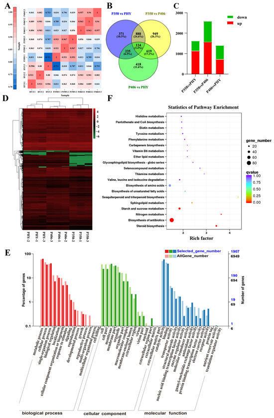 Identification of differentially expressed mRNAs in P. cornucopiae strains P358, PHY, and P406. (A) Sperman correlation analysis showing sample distribution among different groups. (B) Venn diagram showing the DEmRNAs in the three groups. (C) Number of up-regulated and down-regulated DEmRNAs. (D) Heatmap analysis of DEmRNAs. (E) GO enrichment analysis of DEmRNAs. Top 15 GO terms according to annotation analysis. (F) KEGG pathway enrichment analysis of DEGs. Top 20 pathways enriched for DEmRNAs.