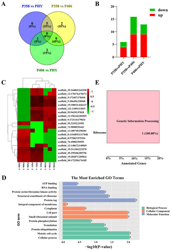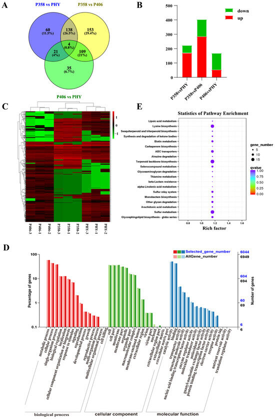 Identification of differentially expressed milRNAs in P. cornucopiae strains P358, PHY, and P406. (A) Venn diagram showing DEmilRNAs in the three groups. (B) Numbers of up- and down-regulated DEmilRNAs. (C) Heatmap analysis of DEmilRNAs. (D) GO enrichment analysis of DEmilRNA target genes. Top 15 pathways enriched for DEmilRNA target genes. (E) KEGG pathway enrichment analysis of DEmilRNA target genes. Top 12 pathways enriched for DEmilRNA target genes.