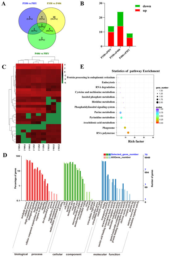 Identification of differentially expressed circRNAs in P. cornucopiae strains, P358, PHY, and P406. (A) Venn diagram showing DEcircRNAs in the three groups. (B) Number of up- and down-regulated DEcircRNAs. (C) Heatmap analysis of DEcircRNAs. (D) GO enrichment analysis of DEcircRNA target genes. (E) KEGG pathway enrichment analysis of DEcircRNA target genes, the numbers in the right of the columns represent the number of genes enriched.