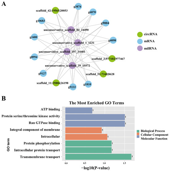 GO enrichment analysis of the mRNAs in the network showed that they were mainly enriched in protein phosphorylation, intracellular protein transport, and transmembrane transport in the BP category; membrane components and intracellular components in the CC category; and ATP binding, protein serine/threonine kinase activity, and Ran GTPase binding in the MF category (Figure 7B). For example, g10683, g9233, and g4098 were enriched in the ‘integral components of the membrane’ category; g8994, g9127, and g1810 were enriched as ‘integral components of membrane and transmembrane transport’; and g3400, g6870, g8994, g9127, and g1810 were enriched for ‘protein serine/threonine kinase activity’, ‘ATP binding’, ‘protein phosphorylation’, and ‘Ran GTPase activity’, which have important roles in color formation. These analyses suggest that the identified circRNA–milRNA–mRNA regulatory network may be related to color regulation in P. cornucopiae. More studies are needed to elucidate the functions of the ceRNAs, milRNAs, and their target genes in cap color formation.