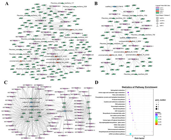 Next, we constructed co-expression networks using all DEmRNA, DElncRNA, DEmiRNA, and DEcircRNA data. The results showed that 215 DEmRNAs, 110 DElncRNAs, 9 DEmiRNAs, and 5 DEcircRNAs were included in mRNA–lncRNA–circRNA–miRNA co-expression networks. The co-expression regulatory networks were classified into three categories. In the first category, 5 miRNAs were in the center of the network, and were co-expressed with 143 mRNAs and 27 lncRNAs, indicating that they potentially play a role in connecting the mRNA and lncRNAs (Figure 8A). In the second category, 4 miRNAs, 16 lncRNAs, 2 circRNAs, and 56 mRNAs formed a complex co-expression regulatory network; lncRNAs and circRNAs in this network may impact the expression and activity of miRNAs through interactions, which in turn co-regulate mRNA expression (Figure 8B). In the third category, 16 mRNAs were co-expressed with 3 circRNAs and 67 lncRNAs, without any milRNAs (Figure 8C).
