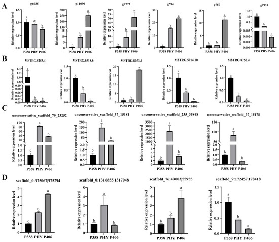 Gene expression analysis by qRT-PCR. Relative expression levels of DEmRNAs (A), DElncRNAs (B), DEmiRNAs (C), and DEcircRNAs (D). The data are expressed as mean values ± standard deviations, and different lowercase letters indicate significant differences (p < 0.05) as determined by ANOVA.