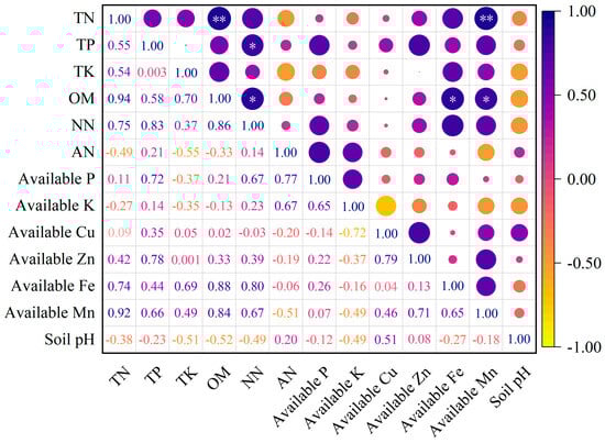 Correlation coefficients among soil nutrients in Vitis vinifera cv. Cabernet Franc vineyards. Note: n = 6; ** and * indicate that the correlation reached significant levels of p < 0.01 and p < 0.05, respectively (Pearson correlation analysis), as shown in the following figure and table; TN, TP, TK, OM, NN, AN, P, K, Cu, Zn, Fe and Mn are abbreviations for total nitrogen, total phosphorus, total potassium, organic matter, nitrate nitrogen, ammonium nitrogen, phosphorus, potassium, copper, zinc, iron, and manganese, respectively.