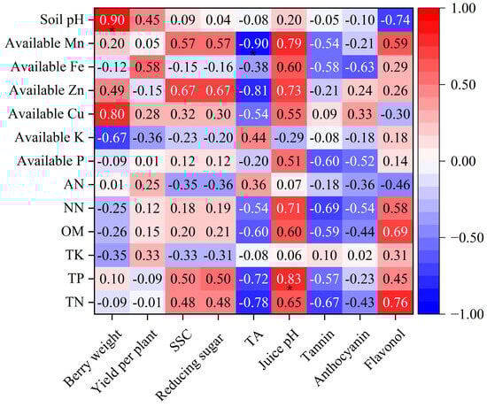 Correlation coefficient between grape quality parameters and soil nutrients. Note: n = 6; TN, TP, TK, OM, NN, AN, P, K, Cu, Zn, Fe, Mn, SSC, and TA are abbreviations for total nitrogen, total phosphorus, total potassium, organic matter, nitrate nitrogen, ammonium nitrogen, phosphorus, potassium, copper, zinc, iron manganese, soluble solid content, and titratable acid, respectively; * indicate that the correlation reached significant levels of p < 0.05.