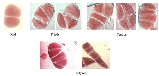 The three main configurations of tetrads observed (linear, tetrahedral, and spherical) are characteristic of normal meiosis in banana (Figure 1). On the other hand, we also observed products of meiotic dysfunction, in particular dyads and triads in non-negligible proportions, which are the result of chromosome restitution in the first or second mitotic division. Finally, we also observed polyads, indicating the presence of lagging chromosomes and, consequently, unbalanced chromosome distributions at the end of the two mitotic divisions. All these sporad patterns were observed, but in varying proportions, in allotetraploid hybrids and also in the Calcutta 4 clone, the pollen fertility reference for this study.