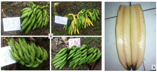 Phenotype of some hybrids from the Banksii 0623 (♀) X FHIA 21 (♂) cross. (A) Some morphologies of the bunches. The numbers in the figures represent the rank of the descendant in the lineage generated. This rank was arbitrary and acted as a unique identifier in the progeny; (B) Ivory colour of the flesh of some bunches.