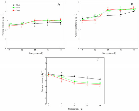 3.2. Effects of Different Cutting Styles on Soluble Sugar Contents of Carrots