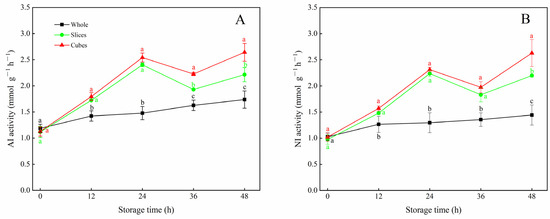 3.3. Effects of Different Cutting Styles on AI and NI Activities of Carrots
