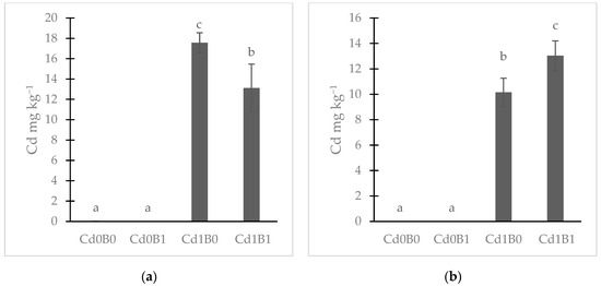 The bioavailable fraction of Cd in soil, estimated with DTPA, showed that in the soils where P. weldenii was grown, DTPA-extractable Cd was 17.6 mg kg−1 at Cd1B0 and it significantly decreased to 13.1 mg kg−1 at Cd1B1 (Figure 1a). Conversely, in the soils with S. oleraceus, DTPA-extractable Cd at Cd1B0 was 10.16 mg kg−1 and it significantly increased to 13.03 mg kg−1 in the case of Cd1B1 (Figure 1b). In the treatments with no added Cd (i.e., Cd0B0 and Cd0B1), no DTPA-extractable Cd was recorded, as expected (Figure 1a,b).