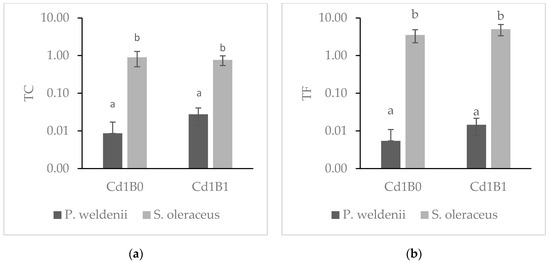 The transfer of Cd from soil to plant (TC) was close to 1 at Cd1B0 for S. oleraceus (0.90) and reached 0.77 at Cd1B1, with both values exhibiting no significant difference. On the other hand, the Cd TC of P. weldenii was much lower, with values equal to 0.0086 and 0.027 at Cd1B0 and Cd1B1, respectively (Figure 2). As for the root-to-shoot translocation (TF), it was well above 1 for S. oleraceus, i.e., 3.53 at Cd1B0 and 5.01 at Cd1B1, while for P. weldenii, the respective TF values were 0.005 and 0.015 for Cd1B0 and Cd1B1.