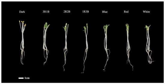 As an extremely important environmental factor in plant growth, light plays a crucial role in regulating plant growth and development, promoting photosynthesis, and even promoting the expression of some genes [,,,,,]. Photosensitive pigments, cryptochromes and other receptor proteins related to photosynthesis exist on the surface of plant cells. Among them, photosensitive pigments mainly absorb red and far-infrared light, and cryptochromes mainly absorb blue and near-ultraviolet light [,]. Previous experimental results have shown that red light promotes morphological indicators such as stem length, leaf area, and fresh weight, while blue light promotes the opening of stomata and the synthesis of photosynthetic pigment proteins in plants [,,,]. There have also been a number of studies on LED light quality to enhance the quality of sprouts. The experimental results of Qian et al. showed that blue light significantly enhanced the total phenolics, anthocyanin content and antioxidant levels, palatability and nutritional value of Chinese kale sprouts []. Ruiz-Nieto et al. concluded that green light increased lentil sprout stem thickness, violet and white lights increased soluble protein content, and blue light increased seed germination, β-carotene and phenolic compound concentrations, and antioxidant activity [].
