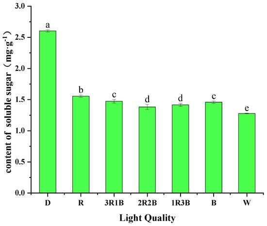Effect of different light qualities on soluble sugar content of alfalfa sprouts (abbreviation: D, dark; R, red; B, blue; W, white. The same as below).