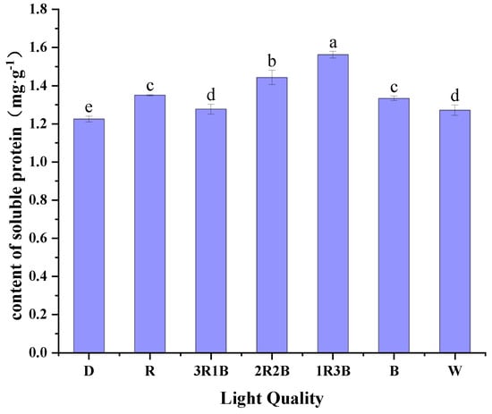 Soluble protein is an important physiological and biochemical index in plants, providing plant nutrients and participating in the osmotic regulation and metabolism of plants. Soluble proteins include a number of enzymes involved in metabolism, and their content can be used as an indicator of the total metabolic capacity of the plant body. Figure 3 shows the effect of different red and blue light on soluble protein content of alfalfa sprouts. Among them, the 1R3B treatment had the highest soluble protein content of 1.56 mg/g after light exposure, which was 8.27–27.52% more compared to the other treatments. 2R2B treatment had the second highest soluble protein content, and the dark treatment had the lowest soluble protein content. Studies have found that the red to blue ratio of 6:3 favors the increase of soluble protein content and the accumulation of antioxidant substances such as anthocyanins and flavonoids in Chinese Kale []. Other studies concluded that 2:1 mixed red and blue color light was beneficial to the soluble protein content and antioxidant activity of black-eyed pea sprouts []. This experiment shows that light treatments are beneficial to the increase in soluble protein content, and that red and blue compound light is to some extent more effective than single red light or single blue light.