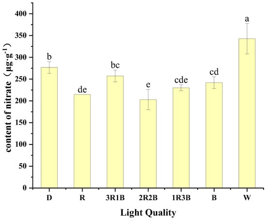 Nitrate is an important form of N and is easily absorbed by the plant body. Nitrate itself is harmless, but if it is converted to nitrite by other means in the plant body and consumed by humans, it will bring a risk of cancer [,]. So reducing nitrate levels in plants via light quality is essential. Figure 4 shows the effect of different red and blue light treatments on nitrate content of alfalfa sprouts. The white light treatment had the highest nitrate content of 342.51 mg/g, which was 23.87–68.95% more compared to the other treatments, and had highly significant differences with the other treatments. This was followed by the dark treatment with 267.51 mg/g of nitrate. The lowest content of nitrate in alfalfa sprouts was 202.73 mg/g in the 2R2B treatment. Zhou et al. showed that mixed red and blue light was more effective than monochromatic red light in reducing nitrate content of lettuce, and the effect was more obvious in the R/B = 4 treatment []. He et al. showed that red/white light = 2:1 can reduce the content of nitrate in cabbage leaves, and the increase in the proportion of red light nitrate reduction effect is not obvious []. Similar to the results of previous studies, the results of this experiment showed that red and blue compound color light could reduce the nitrate content of sprouts to a certain extent. Among them, the 2R2B treatment had the most obvious effect in reducing the nitrate content. The reason for this can be attributed to the fact that the mixed red and blue color light better promotes nitrogen metabolism and reduces nitrate accumulation in the plant.