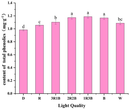 Phenolic compounds are widely found in plants and play an important role in antioxidant and free radical scavenging in plants, such as flavonoids, anthocyanins and other antioxidant substances [,,]. In addition, phenolic compounds, which can confer the taste, aroma and color of vegetables and fruits, are an indispensable class of chemicals. Liu et al. showed that blue light significantly increased the content of all individual phenolics and increased pea sprout ABTS, FRAP, and reducing power. Grzegorz et al. showed that RGB-treated alfalfa sprouts had a higher total phenolic content than cool-white light and warm-white light, and both were higher than the dark treatment. Figure 5 shows the effect on total phenol content of alfalfa sprouts after different red and blue light treatments. After 3 days of light exposure, the highest total phenol content of alfalfa in the 1R3B treatment was 1.19 mg/g, which was 1.24–20.82% more compared to other treatments. Alfalfa sprouts in the dark treatment had the lowest total phenol content of 0.98 mg/g. The total phenolic content of alfalfa sprouts in the 2R2B, 1R3B, and blue light treatments were not significantly different from the total phenol content of the other treatments. Zhang et al. showed that the expression of SmPAL1 and Sm4CL1 was significantly increased by irradiation with mixed red and blue color light. Both of these two genes, as well as the promoters of the genes, respond to red-blue light, leading to the highest levels of phenolic compounds in Salvia miltiorrhiza Bunge when exposed to red–blue light []. The results of this experimental study showed that blue light treatment favored the accumulation of total phenolic content in alfalfa sprouts, which was similar to the previous study. Blue light could significantly increase the content of all phenols, thus elevating the total phenolic content. The total phenolic content of alfalfa sprouts illuminated with a mixture of red and blue light was high compared to blue light alone, perhaps because the mixed-color light benefited the expression of some of the phenolic acids basically.