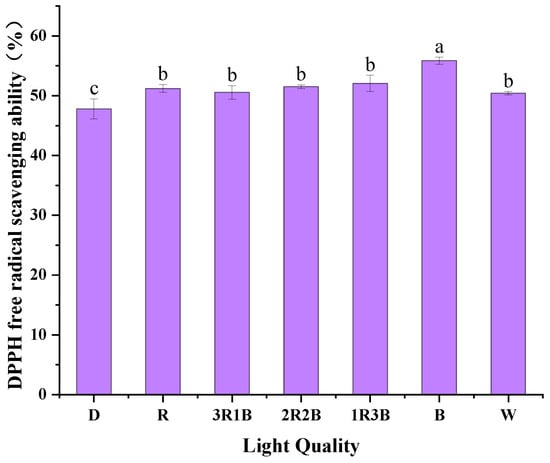 DPPH is commonly used in chemical reactions involving free radicals to reflect the total antioxidant level of a substance [,]. The higher the DPPH free radical-scavenging rate, the higher the total antioxidant capacity of the substance. Figure 6 shows the effect of different light qualities on DPPH radical-scavenging rate in alfalfa sprouts. The blue light treatment had the highest DPPH radical-scavenging rate of 55.86%. It was followed by 1R3B treatment and 2R2B treatment, with 52.07% and 51.50%, respectively. Alfalfa sprouts in the dark treatment had the worst effect on the DPPH radical-scavenging rate of 47.80%. Plant antioxidant activity can be enhanced not only by phenolic acids, but also by quercetin, flavonoids, anthocyanins, vitamin C, photosynthetic pigments antioxidant enzymes and other substances []. Blue light might promote the production of these antioxidants, elevating the overall antioxidant level in the plant bodies.