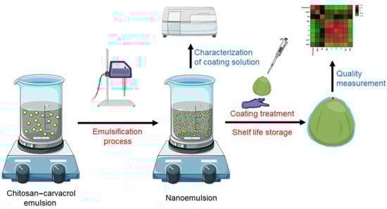 Chitosan, a natural polysaccharide derived from chitin, has garnered significant interest due to its desirable properties, including biodegradability, biocompatibility, antimicrobial properties, and film-forming ability [16]. Notably, the U.S. Food and Drug Administration (FDA) has recognized chitosan as a GRAS polymer [17]. These unique characteristics position chitosan as an excellent candidate for developing edible coatings to preserve fresh produce. Numerous studies have demonstrated the effectiveness of chitosan coatings in reducing respiration rates and microbial decay, delaying senescence, and maintaining postharvest fruit quality attributes [18,19]. Carvacrol (5-isopropyl-2-methyl phenol), a monoterpene compound mainly extracted from oregano and thyme, has received considerable attention due to its broad-spectrum antimicrobial activity and GRAS certification and may act as a novel bio-preservative [20]. Incorporating natural essential oils into polysaccharide-based coatings provides an additional protective barrier to control the release rate and reduce the volatile/oxidation loss of essential oil [21] while simultaneously contributing to better barrier and mechanical properties of the coating [15]. Furthermore, by reducing the particle size of incorporated essential oils to the nanoscale through the emulsion, the specific surface area of oil droplets is significantly increased [22]. This results in improved stability as they become more uniformly distributed within the film-forming solution, thereby enhancing the utilization efficiency of essential oil [23]. Even though the use of chitosan coatings loaded with nanoscale essential oil has shown promising results in extending the shelf life of various fruits, their application on guava still needs to be further studied.