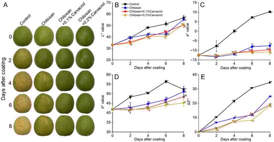 Effects of chitosan–carvacrol coating on appearance and peel color of postharvest guava fruit. The fruit appearance (A), peel L* (B), a* (C), b* (D), and ΔE* (E) in response to chitosan–carvacrol coating. Each value is the mean of three replicates. The vertical bars represent the standard deviation of the means. The different letters indicate significant differences (ANOVA, p < 0.05) according to Duncan’s multiple comparisons test with Holm correction.