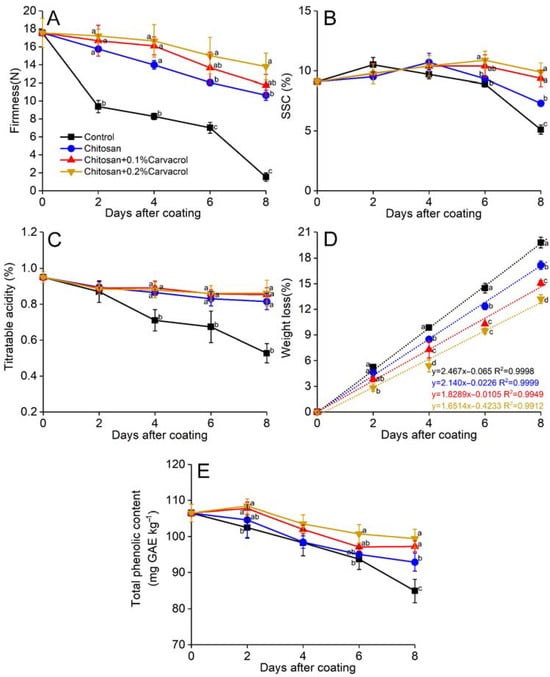 Effects of chitosan–carvacrol coating on quality parameters of postharvest guava fruit. Firmness (A), soluble solid content (SSC; B), titratable acidity (C), weight loss (D), and total phenolic content (E). Each value is the mean of three replicates. The vertical bars represent the standard deviation of the means. The different letters indicate significant differences (ANOVA, p < 0.05) according to Duncan’s multiple comparisons test with Holm correction.