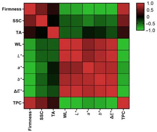 Pearson correlation analysis among the measured parameters. SSC: total soluble solid content; TA: titratable acidity; WL: weight loss; TPC: total phenolic content.