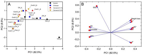 Principal component analysis (PCA) results of measured parameters. Score plot (A), loading plot (B). Con: control; Chi: chitosan; Cvc: carvacrol; SSC: total soluble solid content; TA: titratable acidity; TPC: total phenolic content. The number following the underscore indicates days after coating.